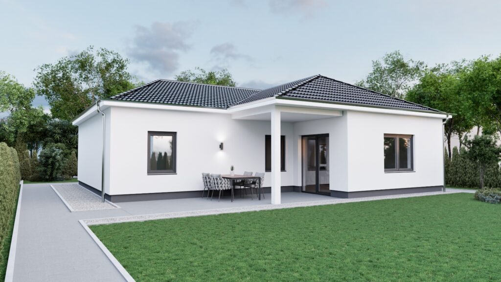Komfort auf einer Ebene. Winkel-Bungalow mit Terrasse.